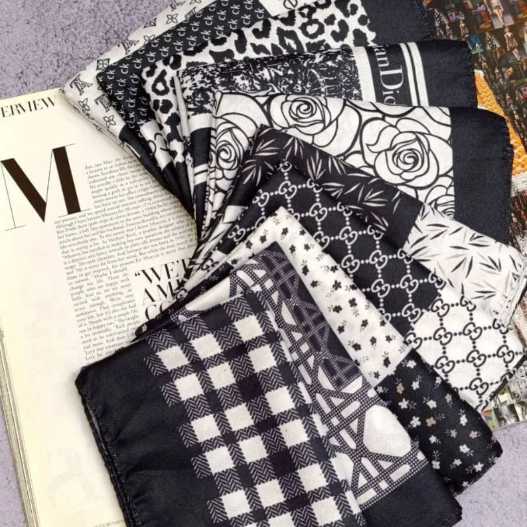 مینی اسکارف نخی تم سفید مشکی طرحهای متنوع قواره ۷۰×۷۰ اصلا سر نیست با احترام ۱۱۰ #مینی_اسکارف_نخی